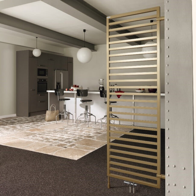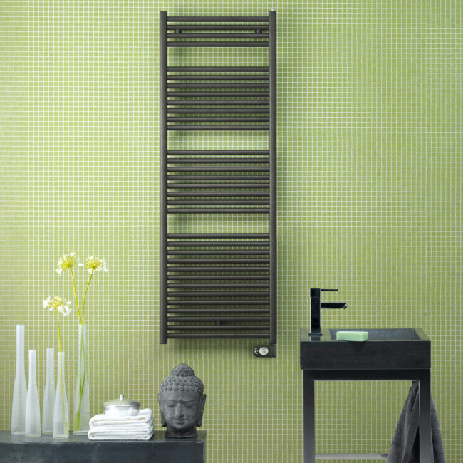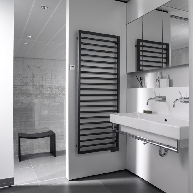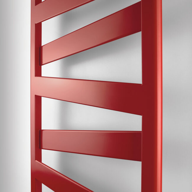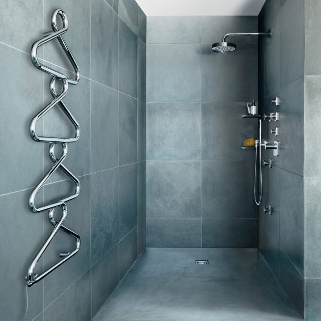 - Towel warmers and designer radiators in various colors, shapes, and sizes