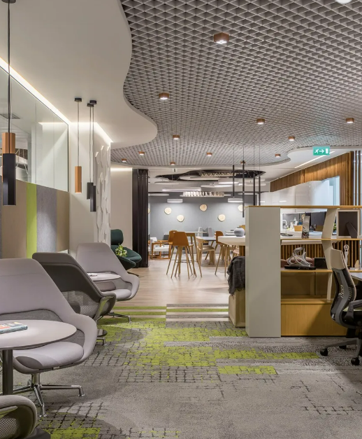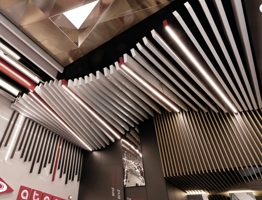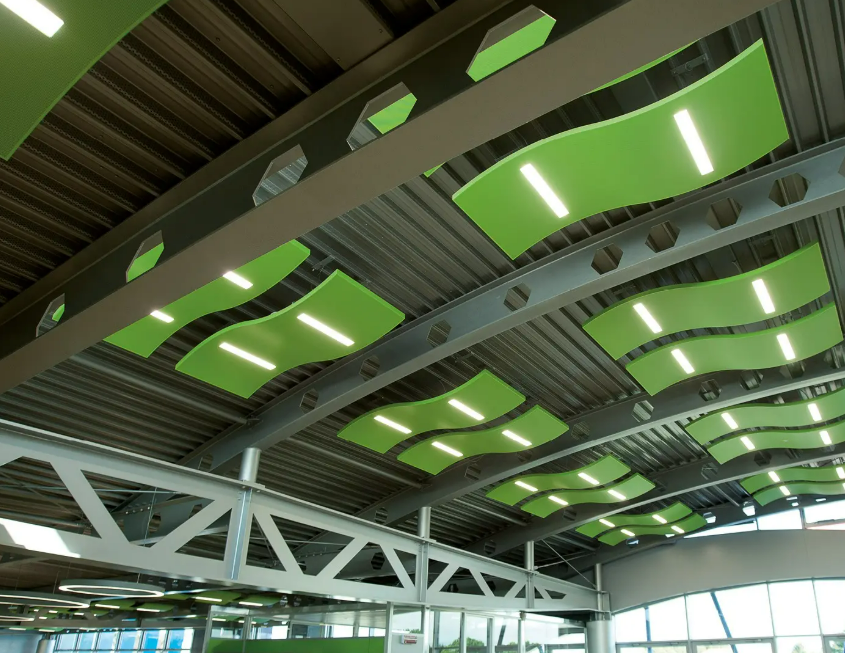 Atena ceiling solutions are suitable for both public and commercial spaces – shopping centers, offices, exhibition halls, and transport infrastructure. The ceilings are available in a variety of perforations, colors, and customizable modules, with options to integrate lighting, ventilation, and heating systems.