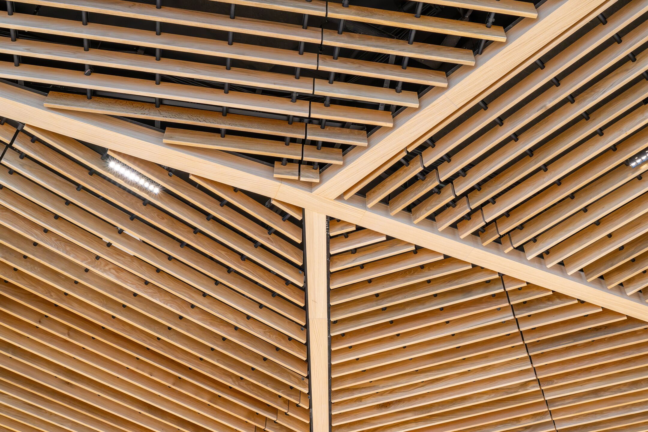 The manufacturer offers a variety of ceiling types, including slats, panels, linear modules, acoustic islands, and felt systems that have become a key trend in modern interiors. Wooden ceilings stand out for their authenticity and natural warmth, while metal systems provide exceptional durability and technical performance.