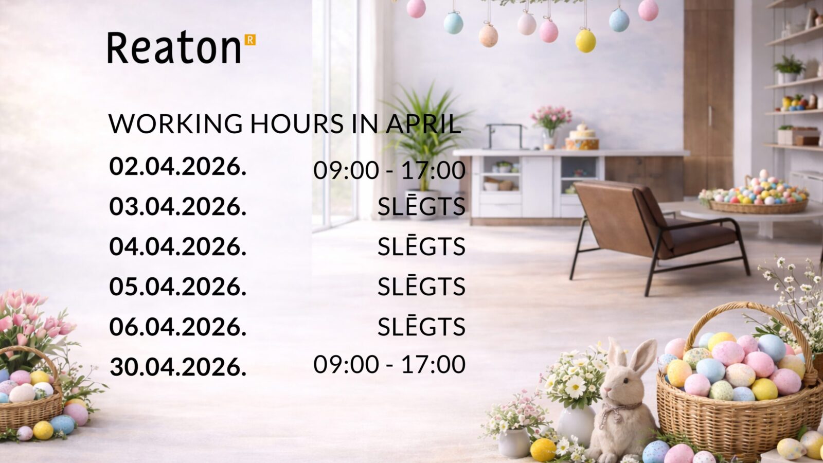 Reaton architecture and construction center working hours in april: 02.04.2026. 09:00 – 17:00 03.04.2026. closed 04.04.2026. closed 05.04.2026. closed 06.04.2026. closed 30.04.2026.