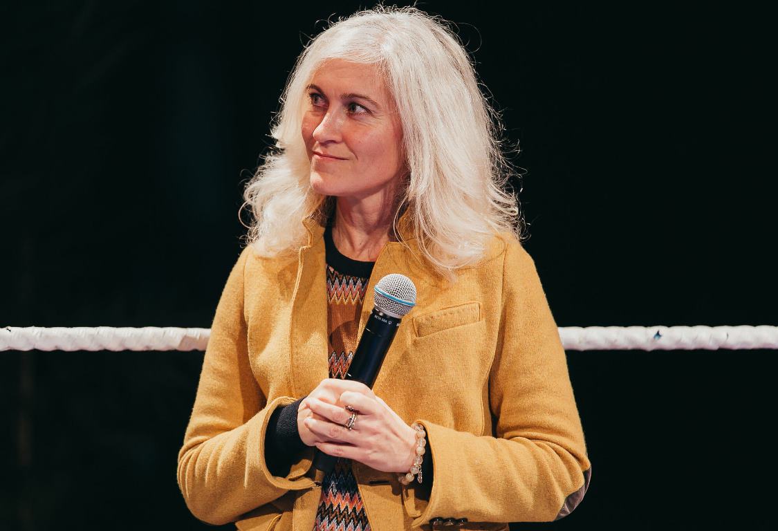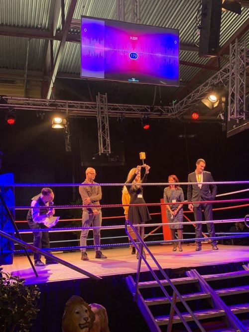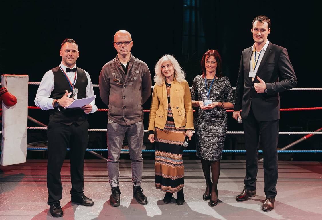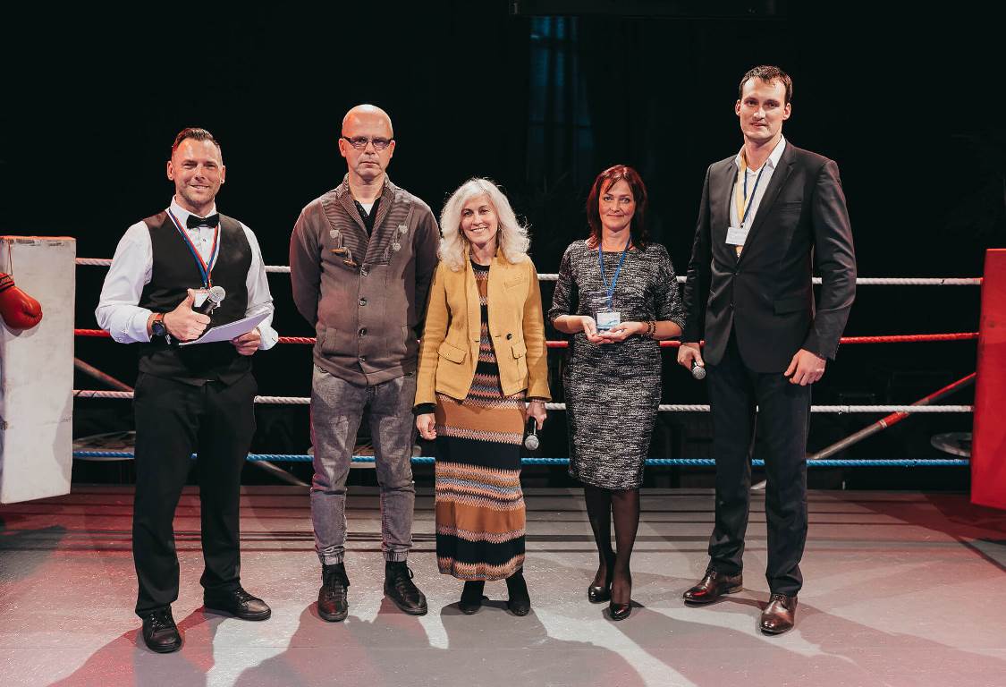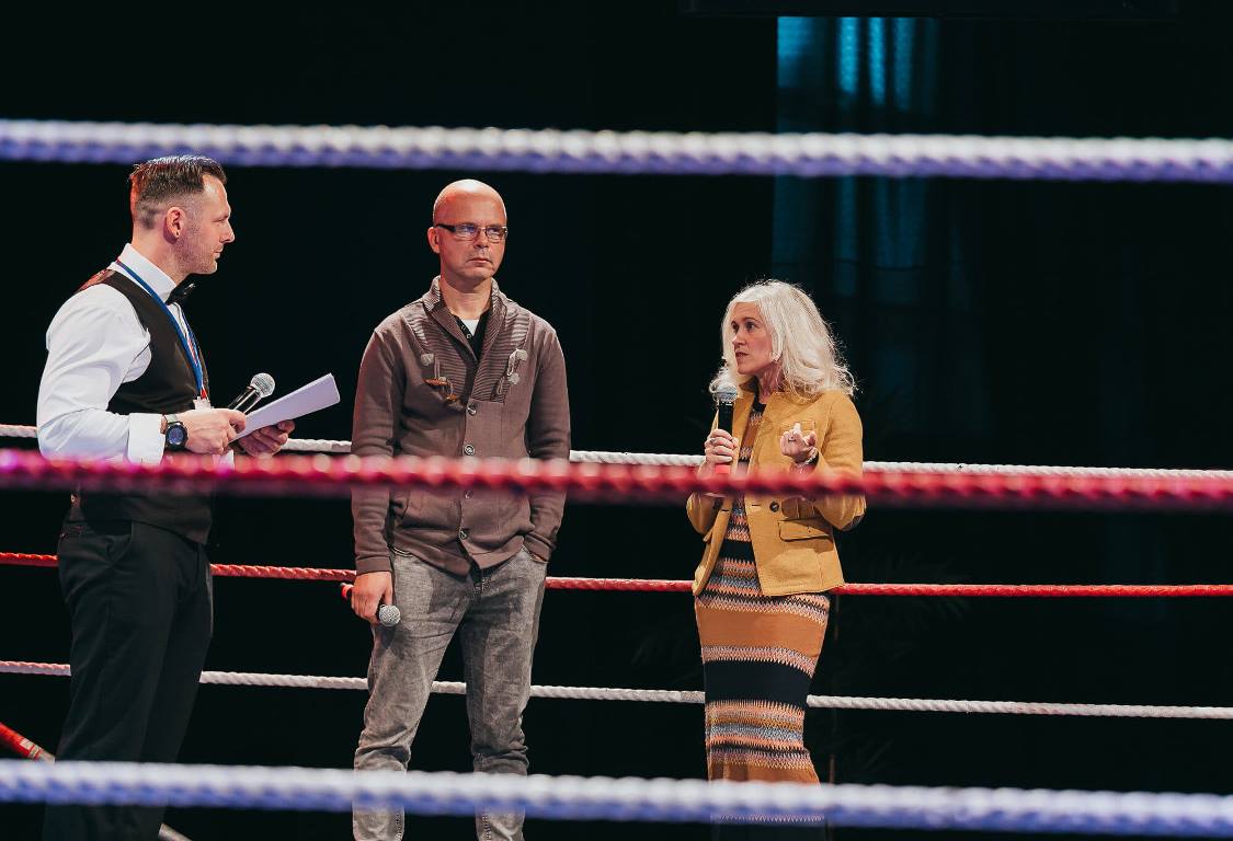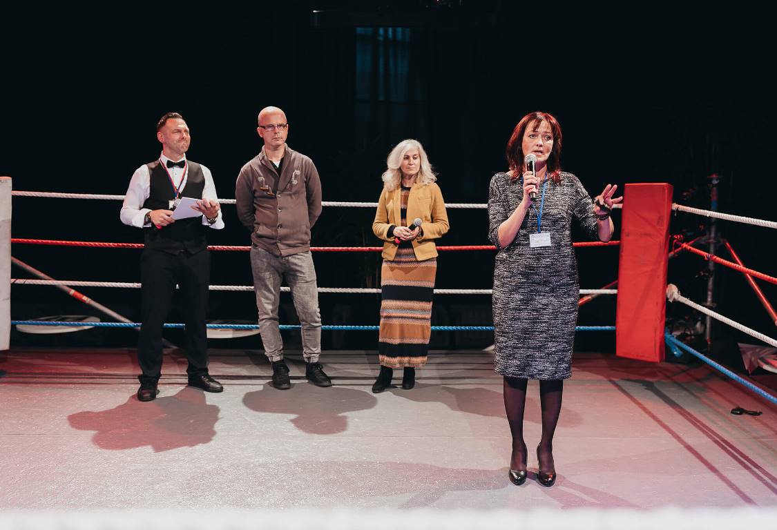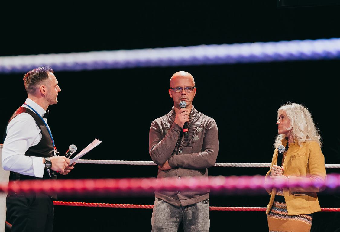 Reaton experts “fought” in the stylised ring: builder Aigars Putriņš, designer Agita Krūze and expert of finishing materials Egita Spunde.
