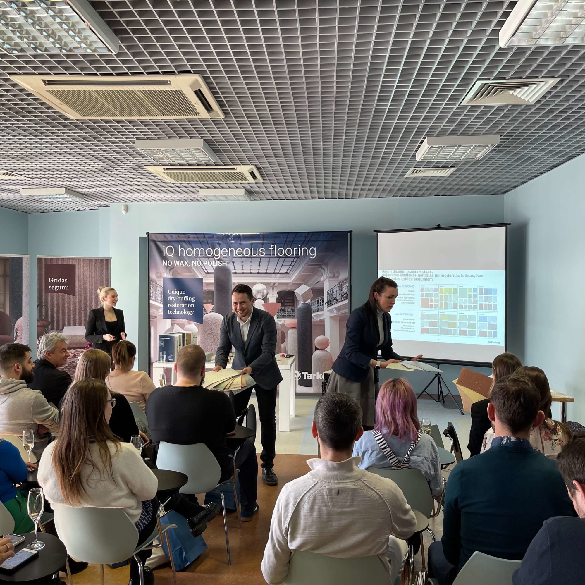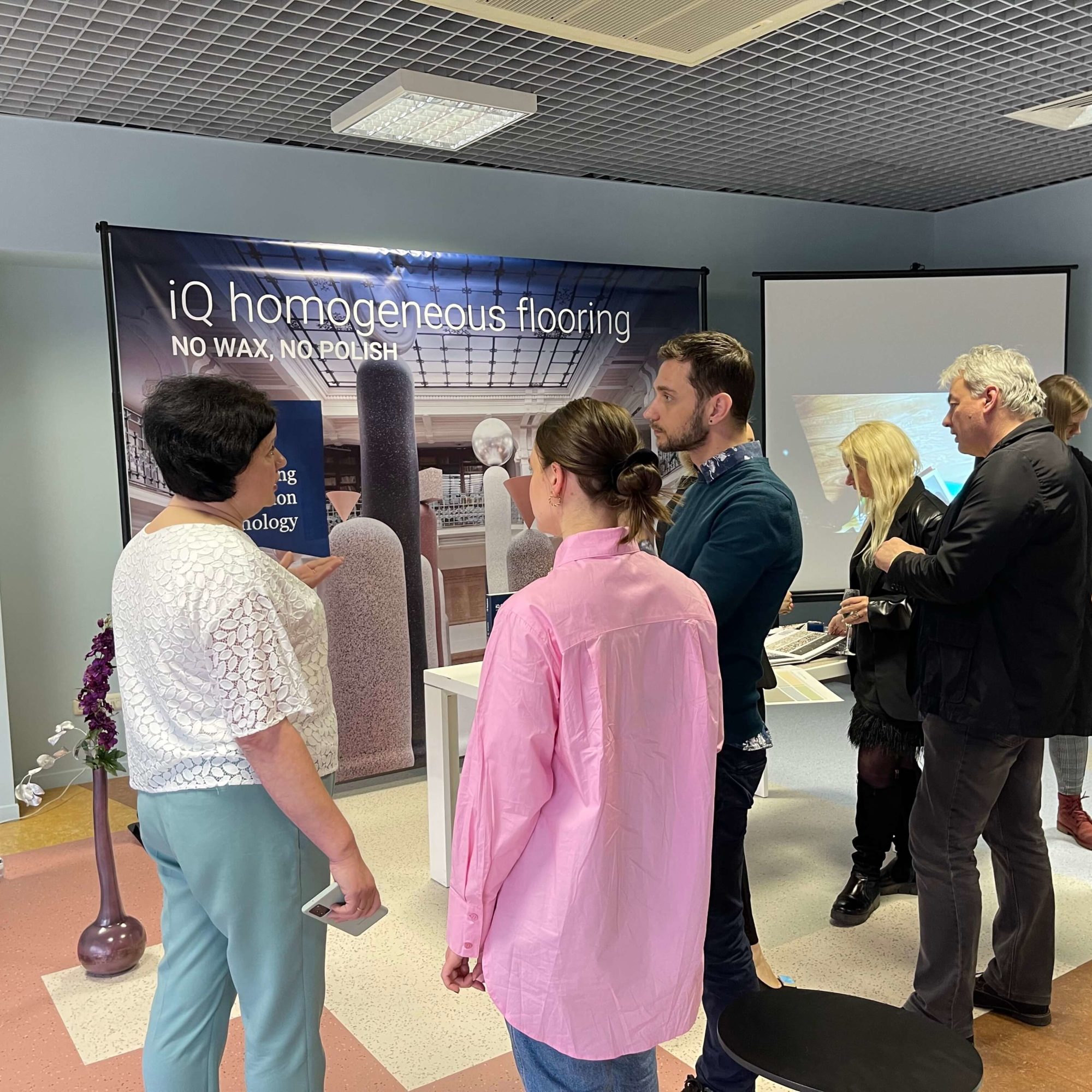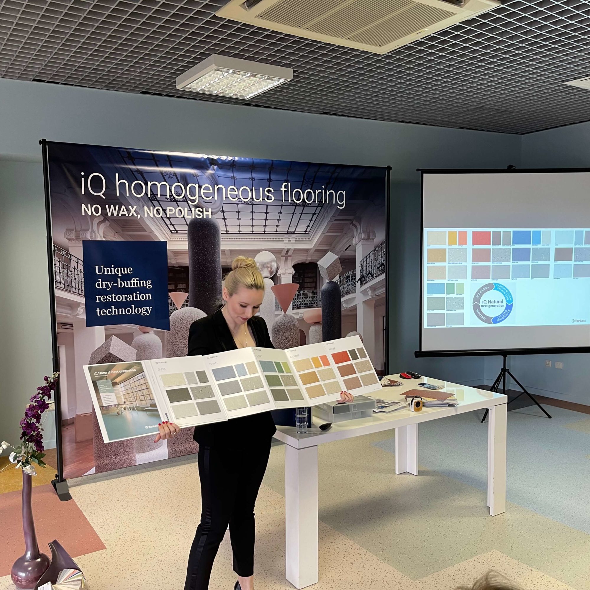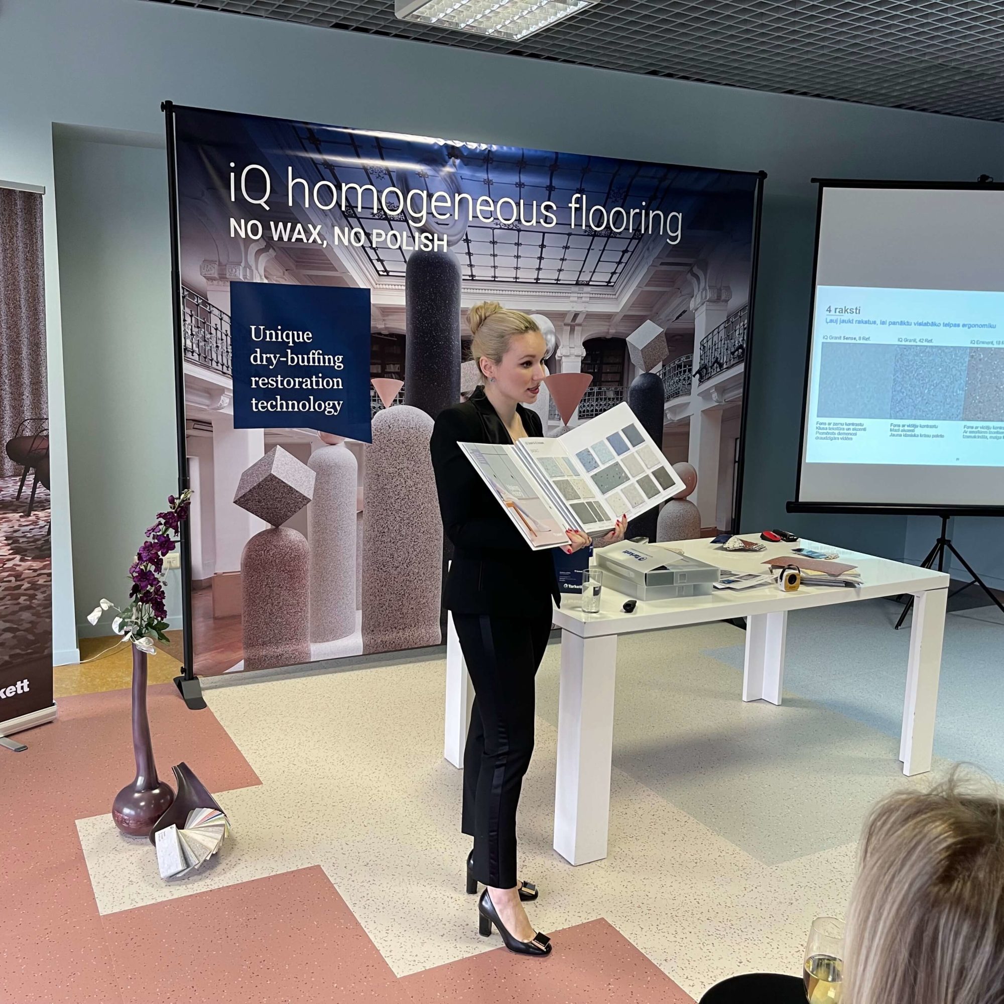 «Tarkett» pārdošanas un mārketinga speciāliste Svetlana Lesiņa, prezentācijā iepazīstināja ar «iQ Eminent» un «iQ Granit» kolekcijām, kas izveidotas uz «Tarkett» 50 gadu + pieredzes pamata un kas turpinās veidot vēsturi nākamajos gados visapkārt mums – slimnīcās, skolās, darbavietās, viesnīcās, lidostās un citur.