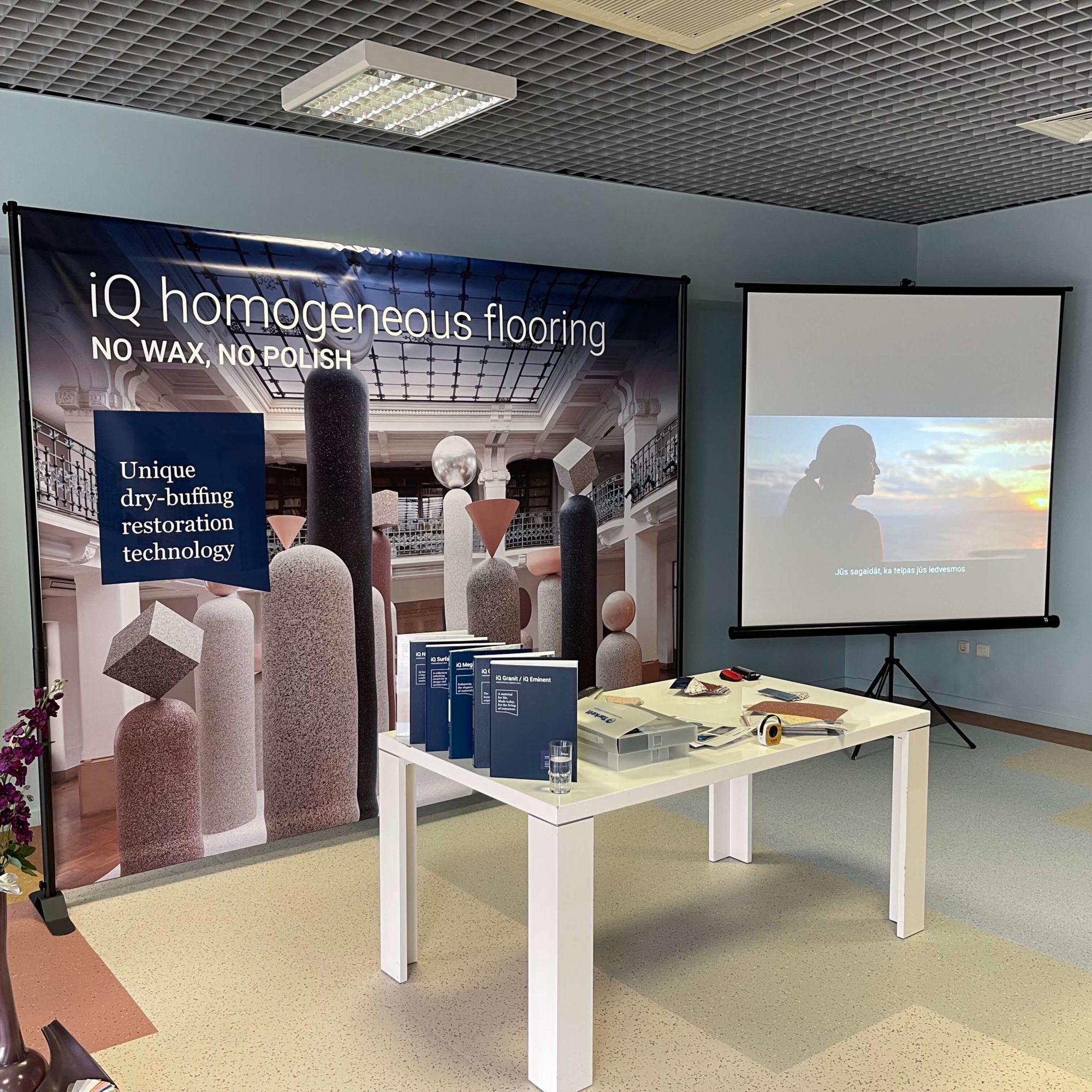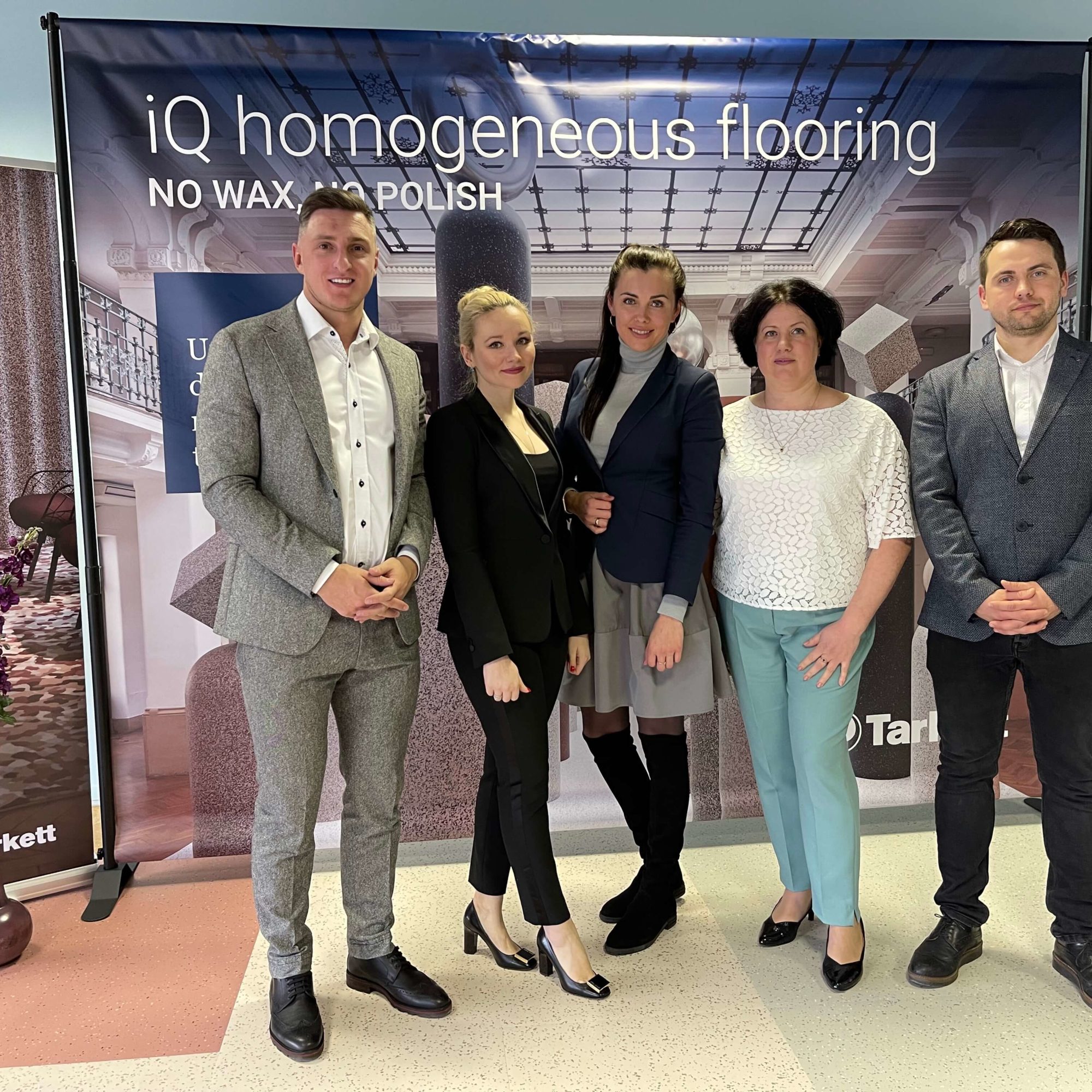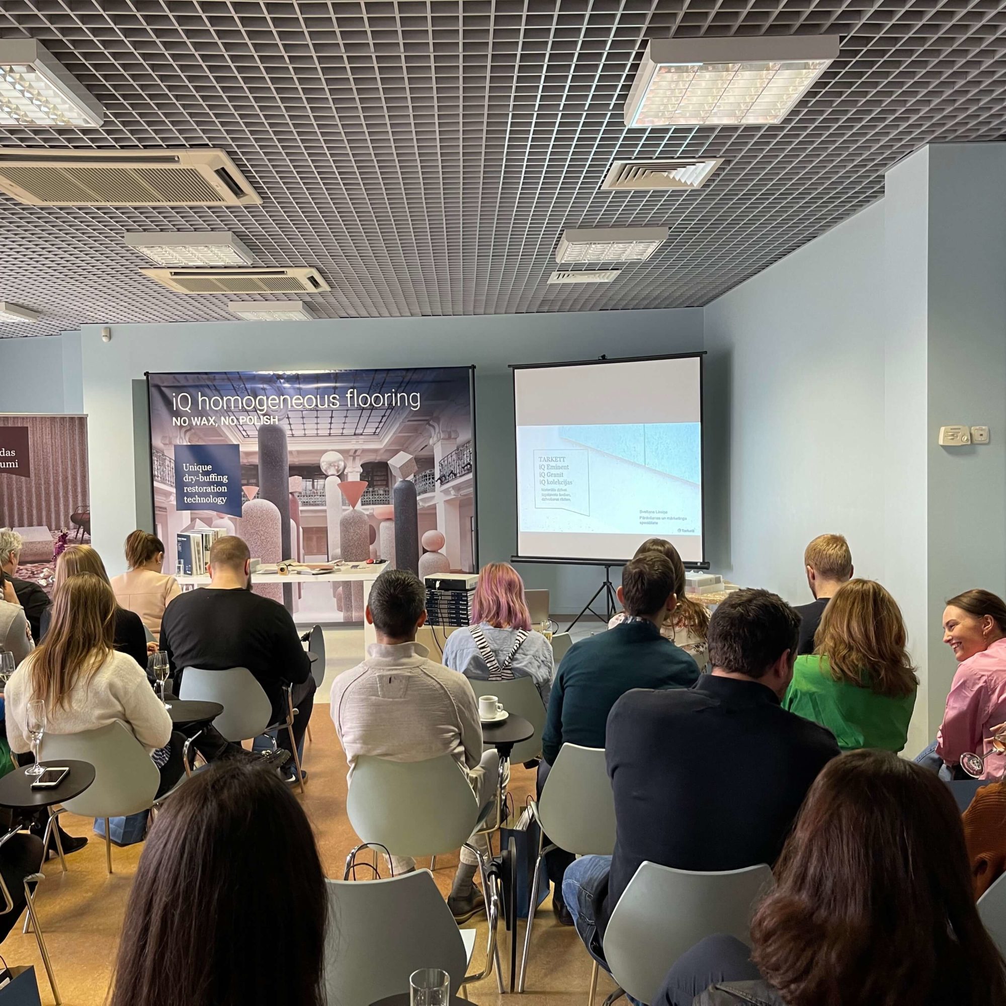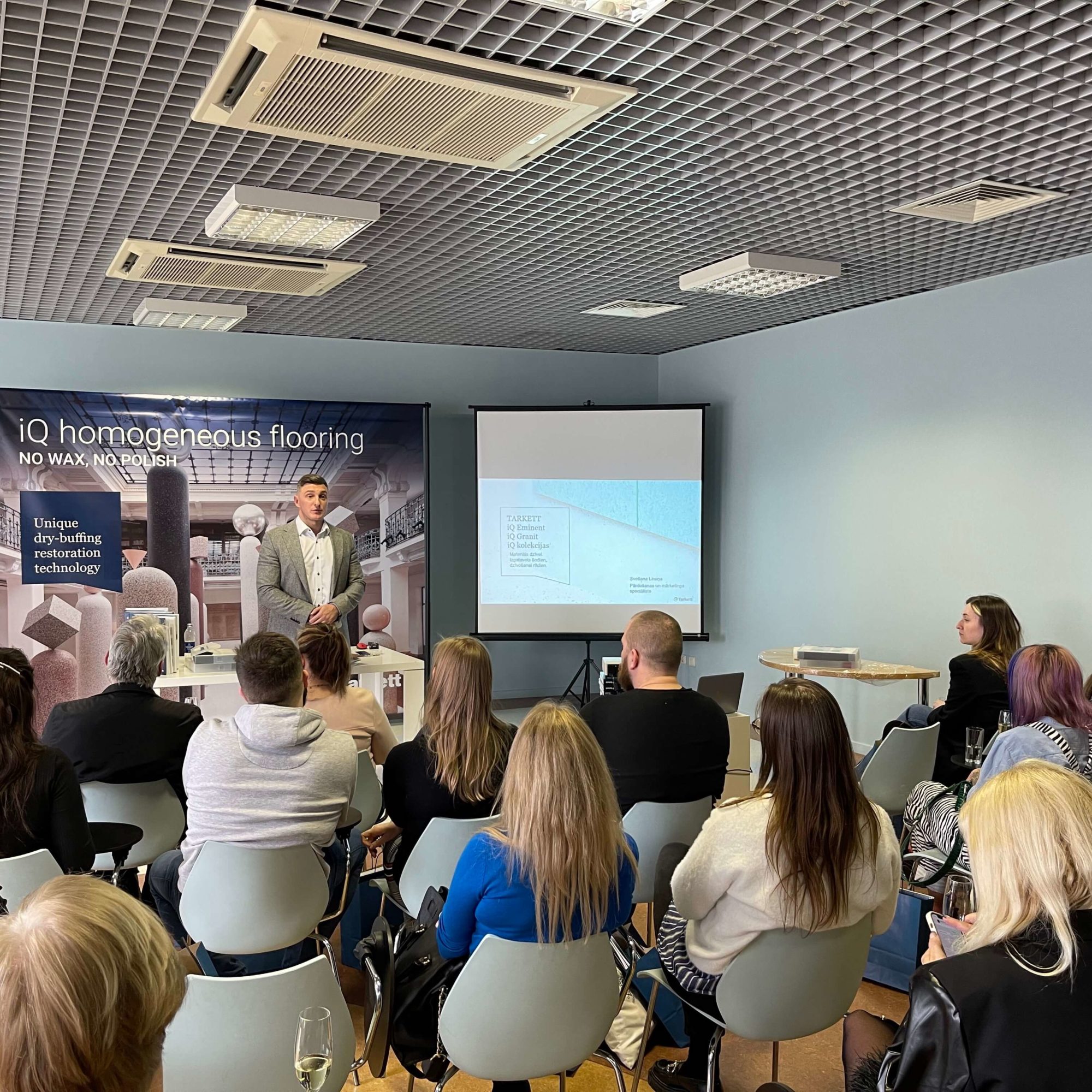 «Tarkett» pārdošanas un mārketinga speciāliste Svetlana Lesiņa, prezentācijā iepazīstināja ar «iQ Eminent» un «iQ Granit» kolekcijām, kas izveidotas uz «Tarkett» 50 gadu + pieredzes pamata un kas turpinās veidot vēsturi nākamajos gados visapkārt mums – slimnīcās, skolās, darbavietās, viesnīcās, lidostās un citur.