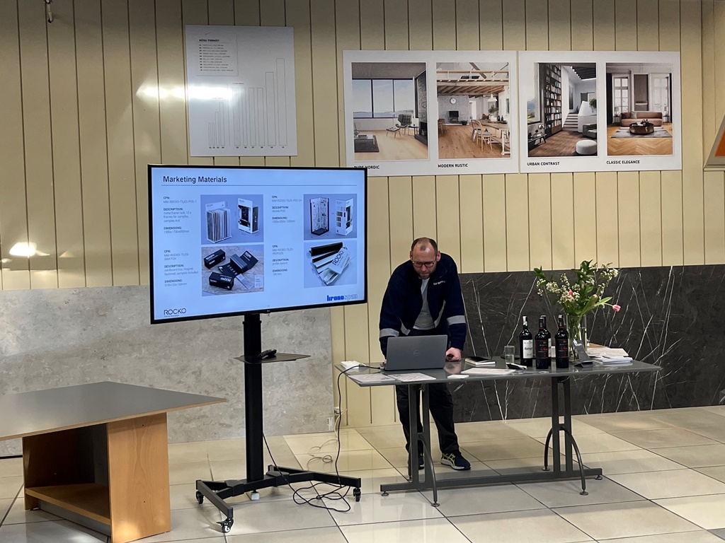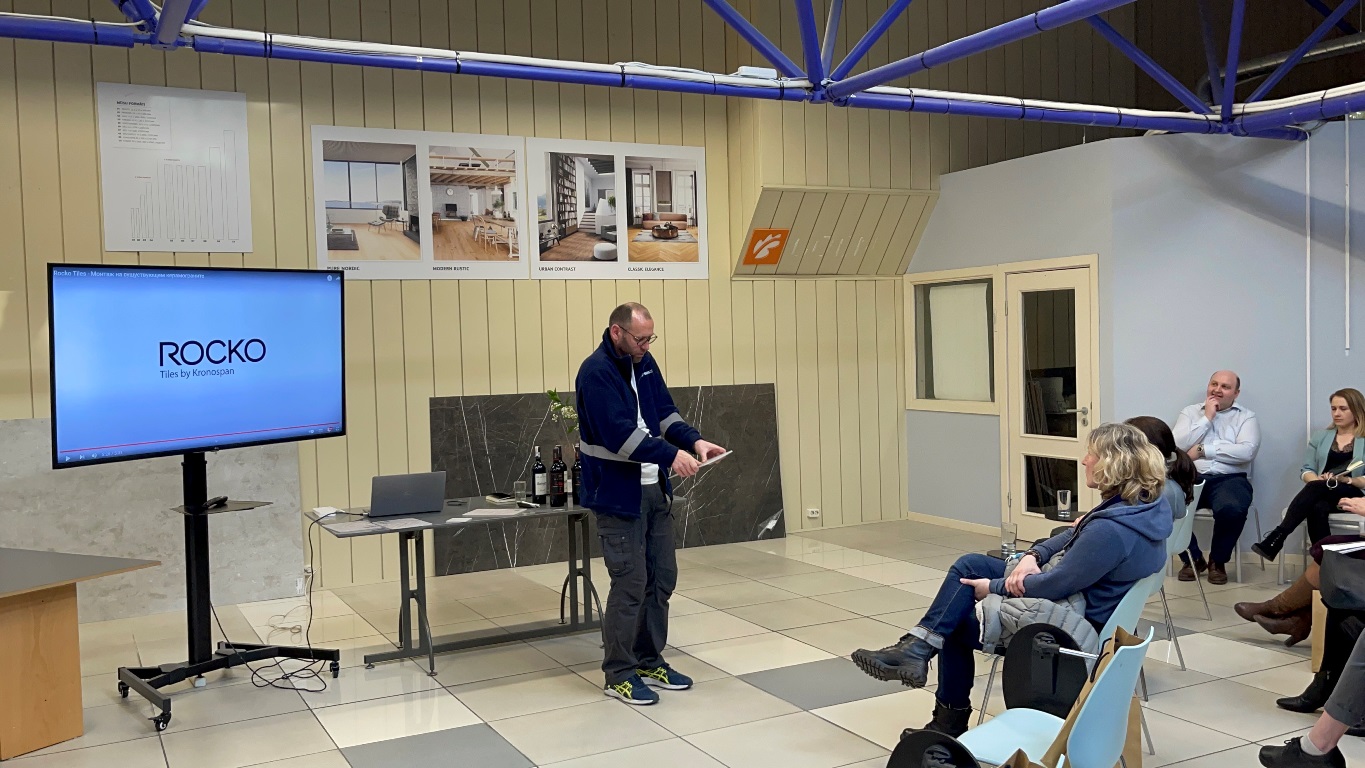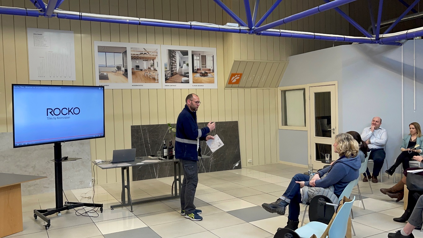Prezentācijas pirmajā daļā, viesi tika iepazīstināti ar Rocko sienas paneļu priekšrocībām, sastāvu, pielietošanas iespējām, kā arī varēja apskatīt uz vietas paraugus. Rocko sienas paneļi ir jaunums un inovācija Kronospan plašajā produktu klāstā. Jaunās paaudzes sienas paneļi ir dekoratīvas, ūdensizturīgas, neticami vieglas sienas flīzes. Paneļu priekšrocība ir to neparasti lielais izmērs – 2800×1230 mm,  taču tajā pašā laikā viena flīze sver tikai 28 kg un ir ļoti plāna. To arī demonstrēja Kronospan pārdošanas pārstāvis, ceļot un pārvietojot parauga paneļus pa zāli un, izurbjot tajā caurumu, parādot, cik viegli un nebojājot materiālu, tas ir izdarāms.