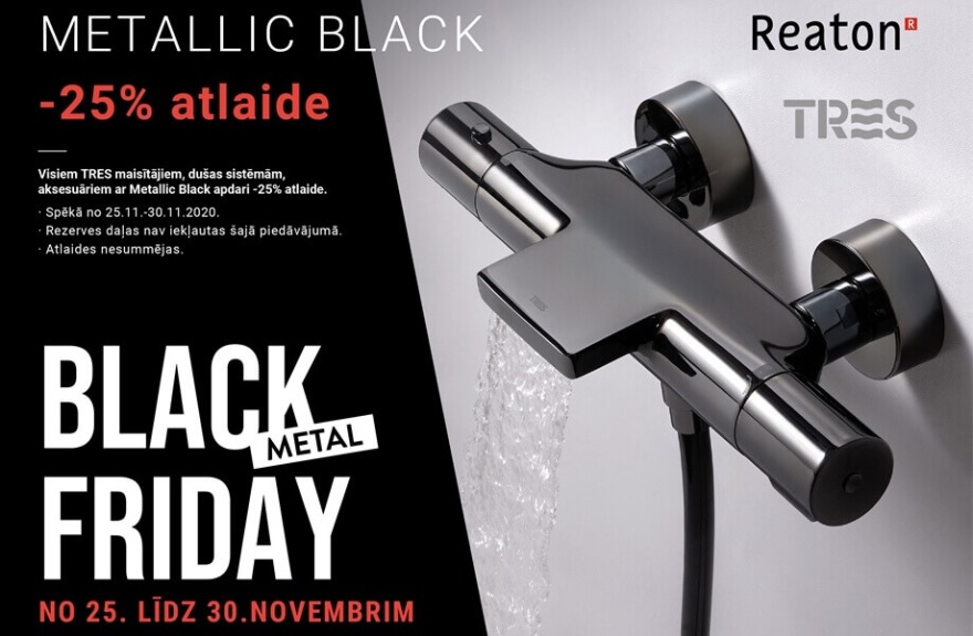 Melnajā piektdienā viss ir iespējams! Visiem TRES maisītājiem, dušas sistēmām un aksesuāriem ar Metallic Black apdari -25% atlaide. Rezerves daļas nav iekļautas piedāvājumā. Atlaides nesummējas.