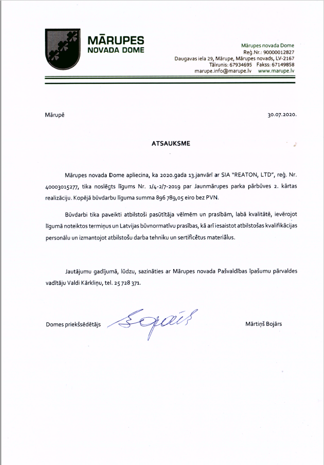 Mārupes novada Domes priekšsēdētāja atsauksme: “Būvdarbi tika paveikti atbilstoši pasūtītāja vēlmēm un prasībām, labā kvalitātē, ievērojot līgumā noteiktos termiņus un Latvijas būvnormatīvu prasības, kā arī iesaistot atbilstošas kvalifikācijas personālu un izmantojot atbilstošu darba tehniku un sertificētus materiālus”.