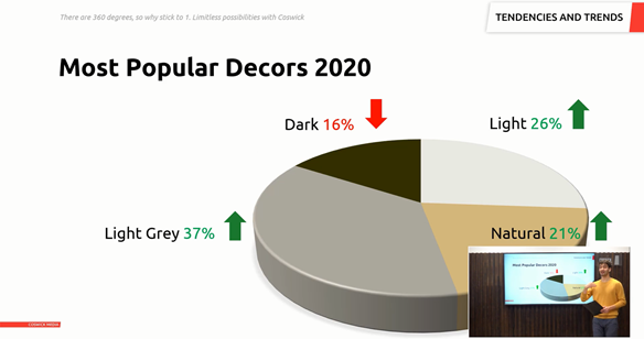 Pēdējo gadu tendence ir izvēlēties gaišus grīdas segumus, savukārt pieprasījums pēc tumšu krāsu un dekoru grīdām samazinās. Šādas tendences izmaiņas ietekmē klientu vēlme pēc gaišiem, dabiskiem dekoriem un krāsām projektos. Turklāt gaišie grīdas segumi ir universālāki un vieglāk integrējami dažādos interjera stilos.
