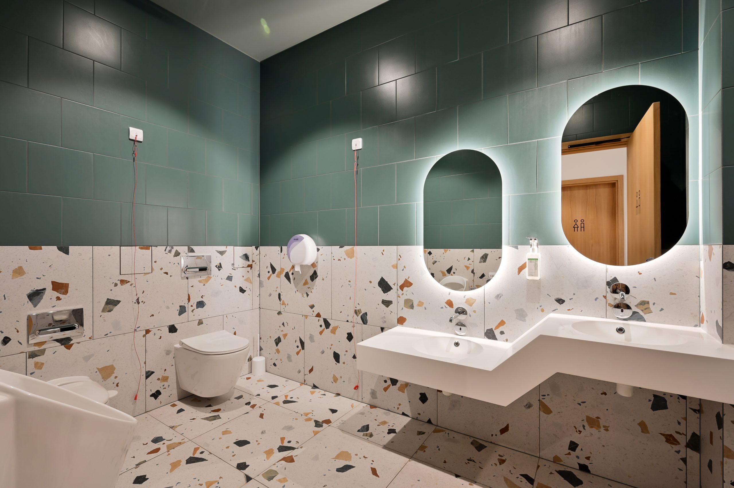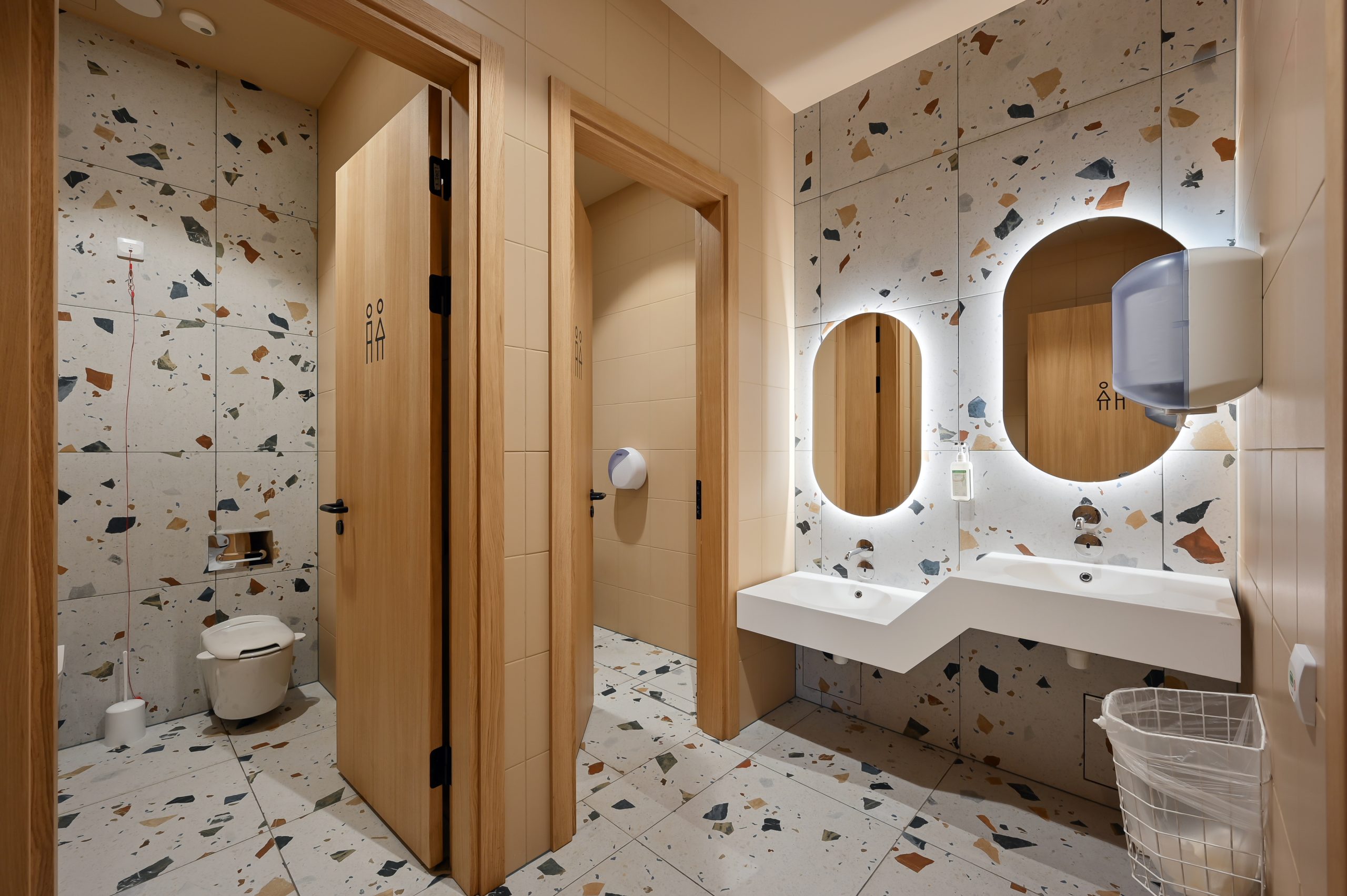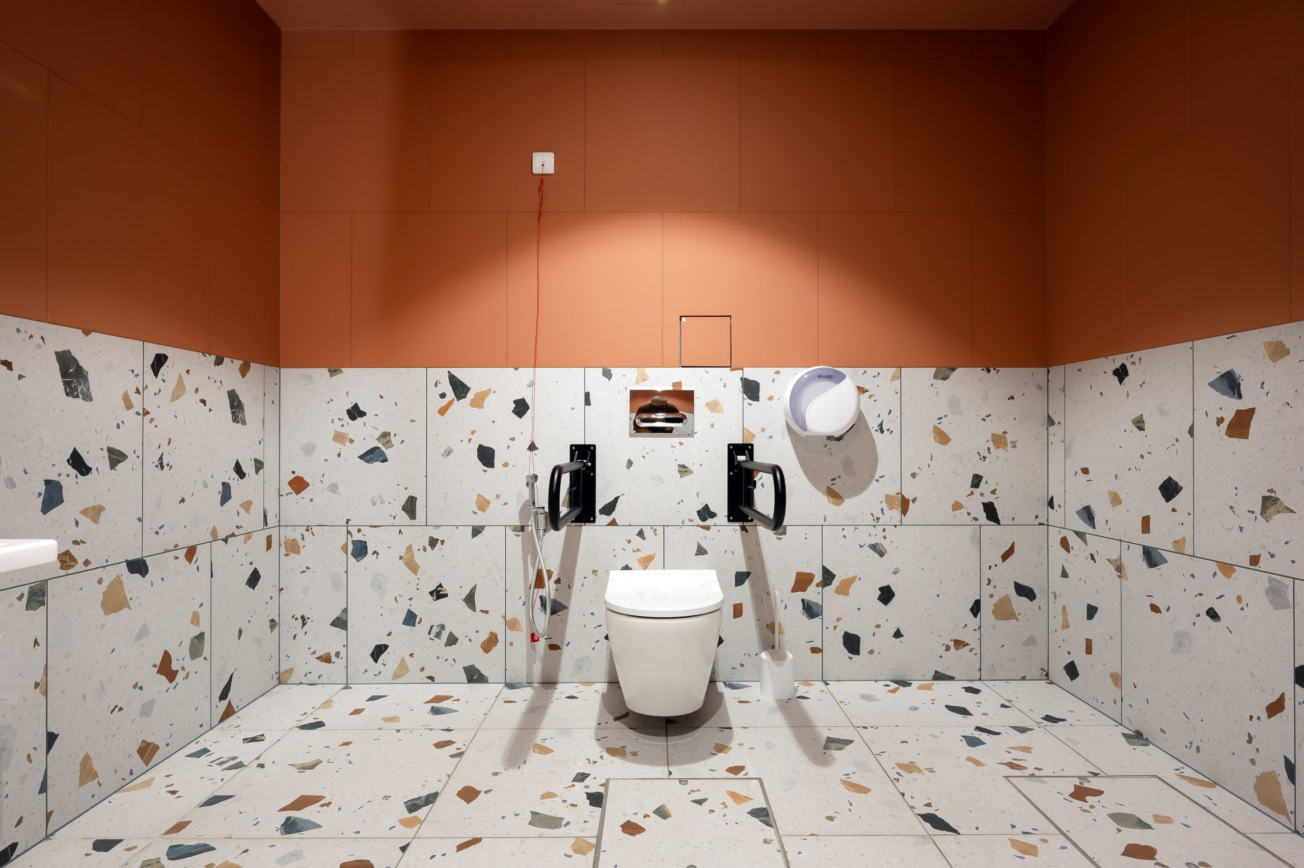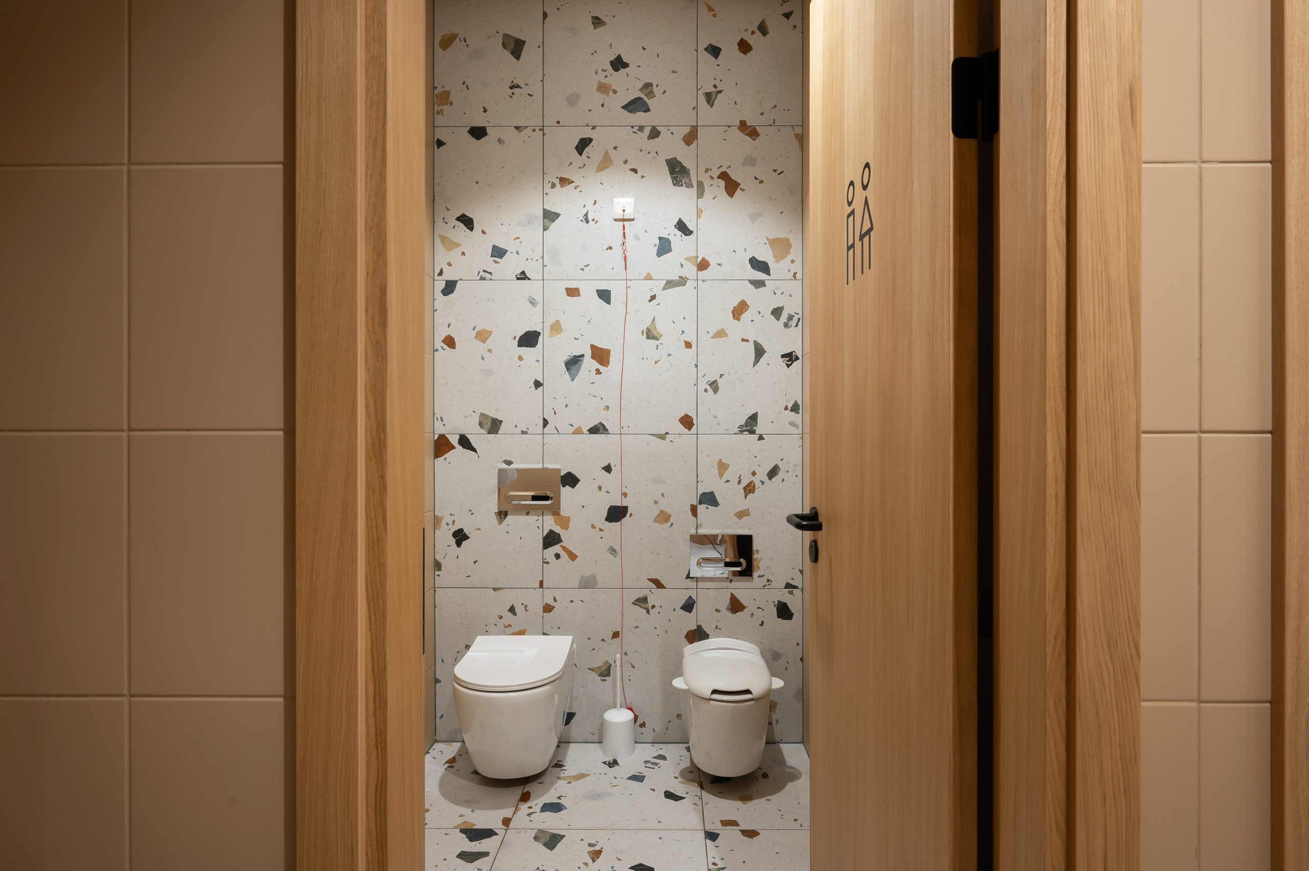 - Sienas un grīdas flīzes no Arcana Ceramica, kolekcija Stracciatella (terazzo). Apjoms 422 m².