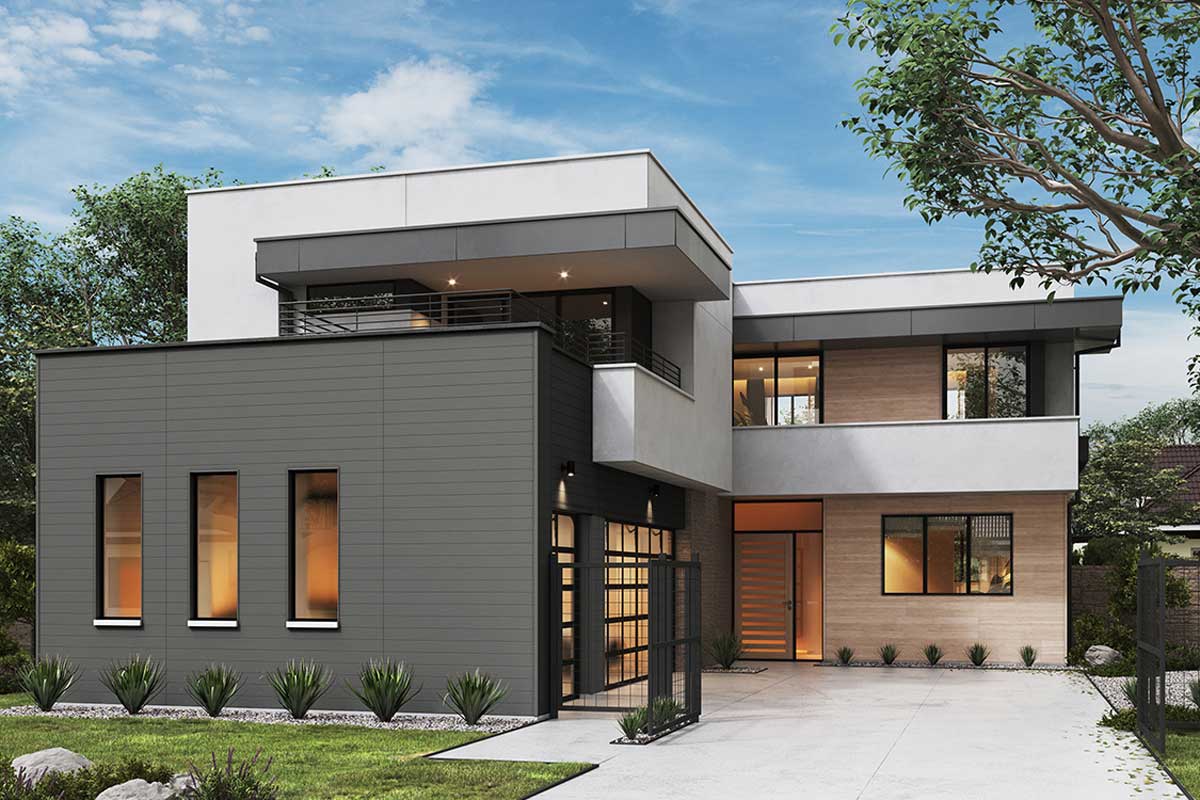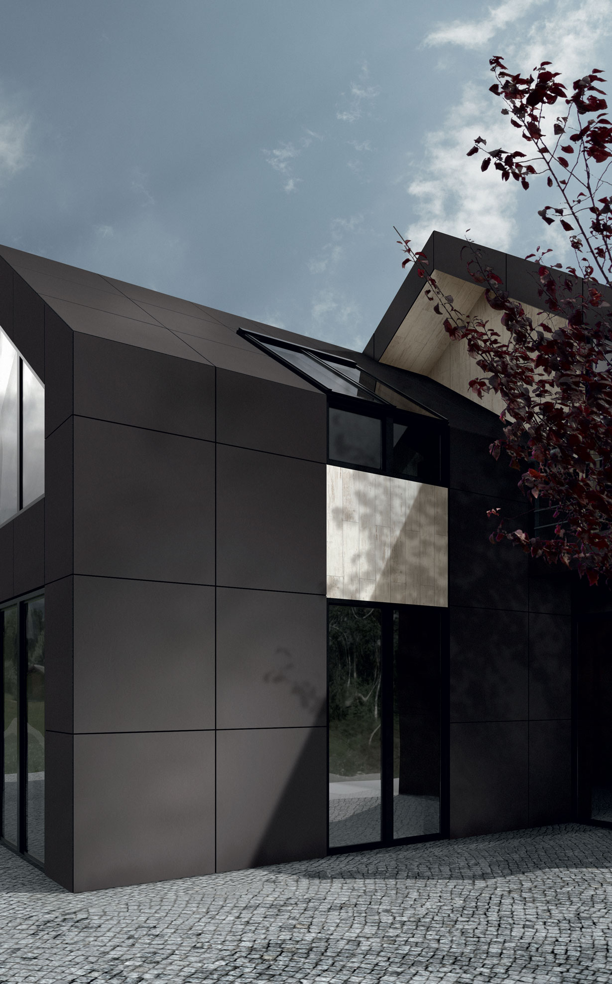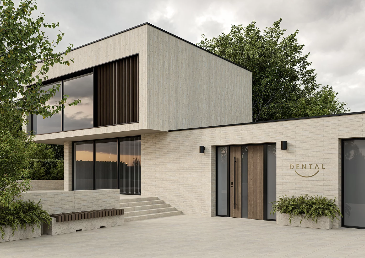 Minimālisma un mūsdienu arhitektūras fasādēm ar plašām virsmām.